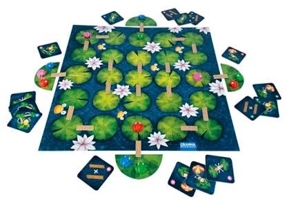 Soyez le premier à mener vos 3 grenouilles sur les nénuphars adverses. Mais attention, à chaque fois que vous sautez, la passerelle reliant les 2 nénuphars disparait et le chemin devient alors plus compliqué. Grouille Grenouille est un jeu de réflexion tout simple et très malin où il d’agira de ne pas rester à gober les mouches !