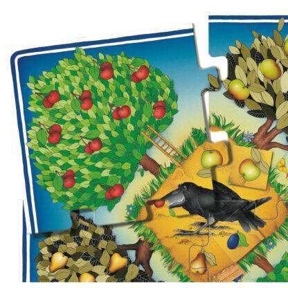 Suivant le lancer de dé, on doit cueillir un fruit de la couleur indiquée ou mettre au centre du plateau un morceau du puzzle du corbeau. L’objectif de ce jeu coopératif est de finir la cueillette avant que le puzzle soit terminé. Ainsi, tous les joueurs gagnent ensemble. Sinon, c’est le corbeau qui mange les fruits restant dans les arbres.